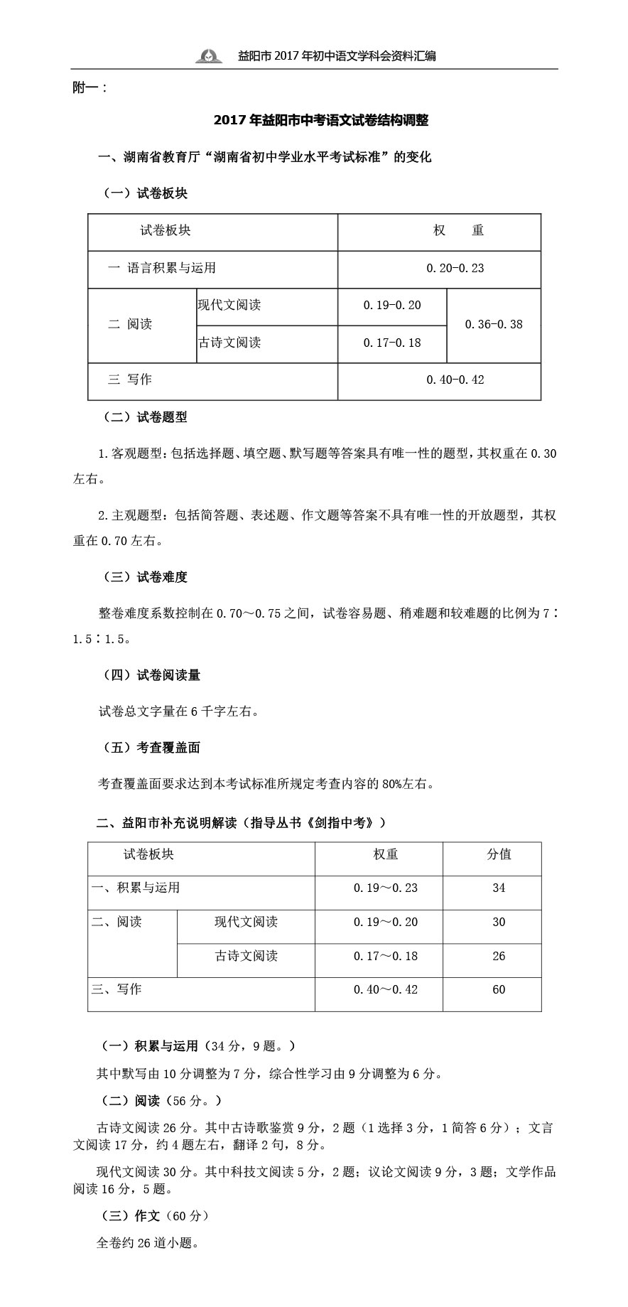 2017年益阳市中考语文试卷结构调整